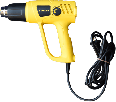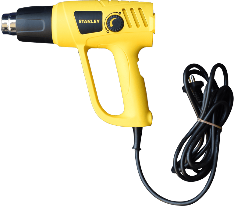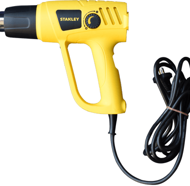 A handheld device used to emit a controlled stream of hot air to shrink plastic film tightly over a bunch of bottles,