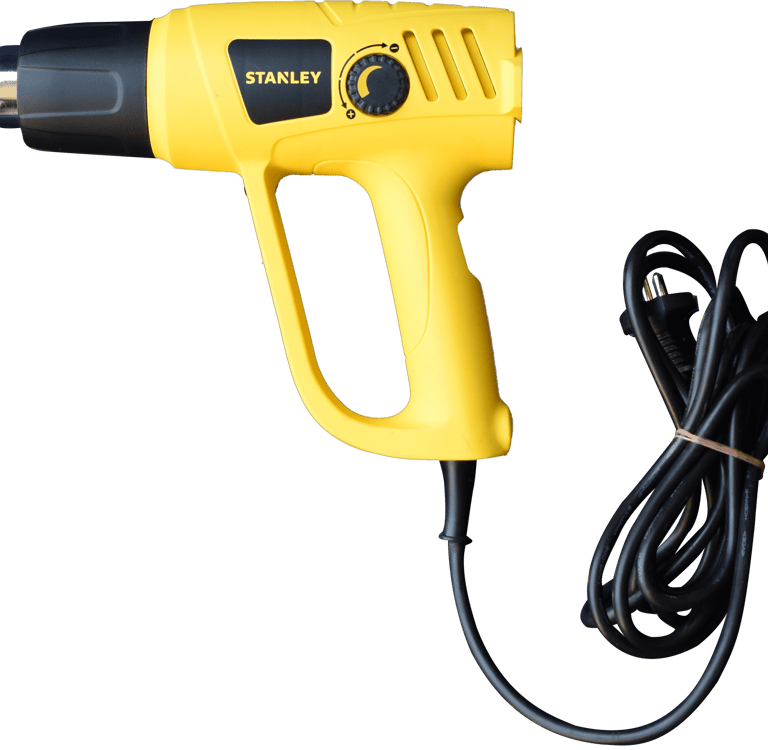 A handheld device used to emit a controlled stream of hot air to shrink plastic film tightly over a bunch of bottles,